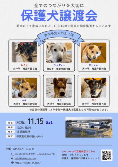 2025年11月11日 お知らせ 11/15(土)10:00~15:00に市原刑務所様の譲渡会にLink toの保護犬が参加させていただきます。 ぜひ皆様のご参加をお待ちしております☆ 里親募集中のワンコの一覧はこちらからご覧下さい。